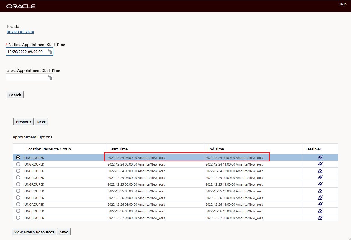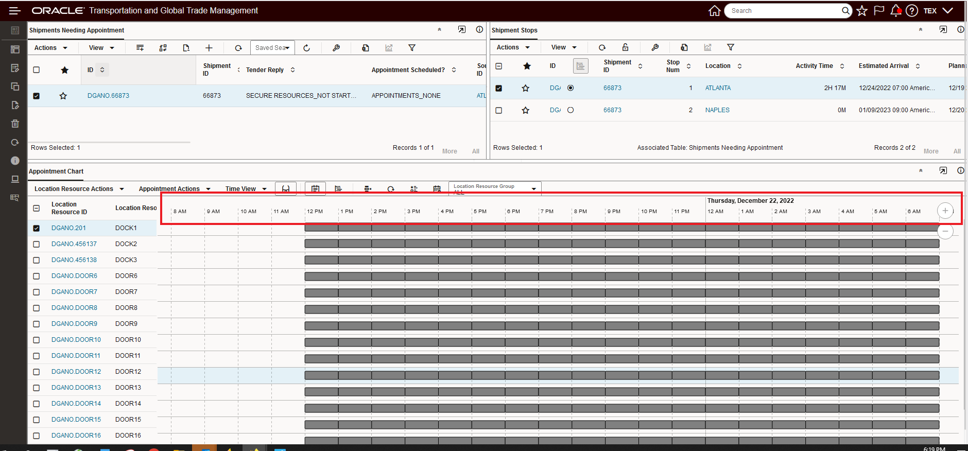 This feature will refocus the Gantt to show the time range related to the result of action being run. In the example below, the initial focus is on Wednesday December 21st and Thursday December 22. In this example, an appointment will be scheduled for the 20th and the Gantt will automatically refocus to the slot where the appointment has been scheduled.