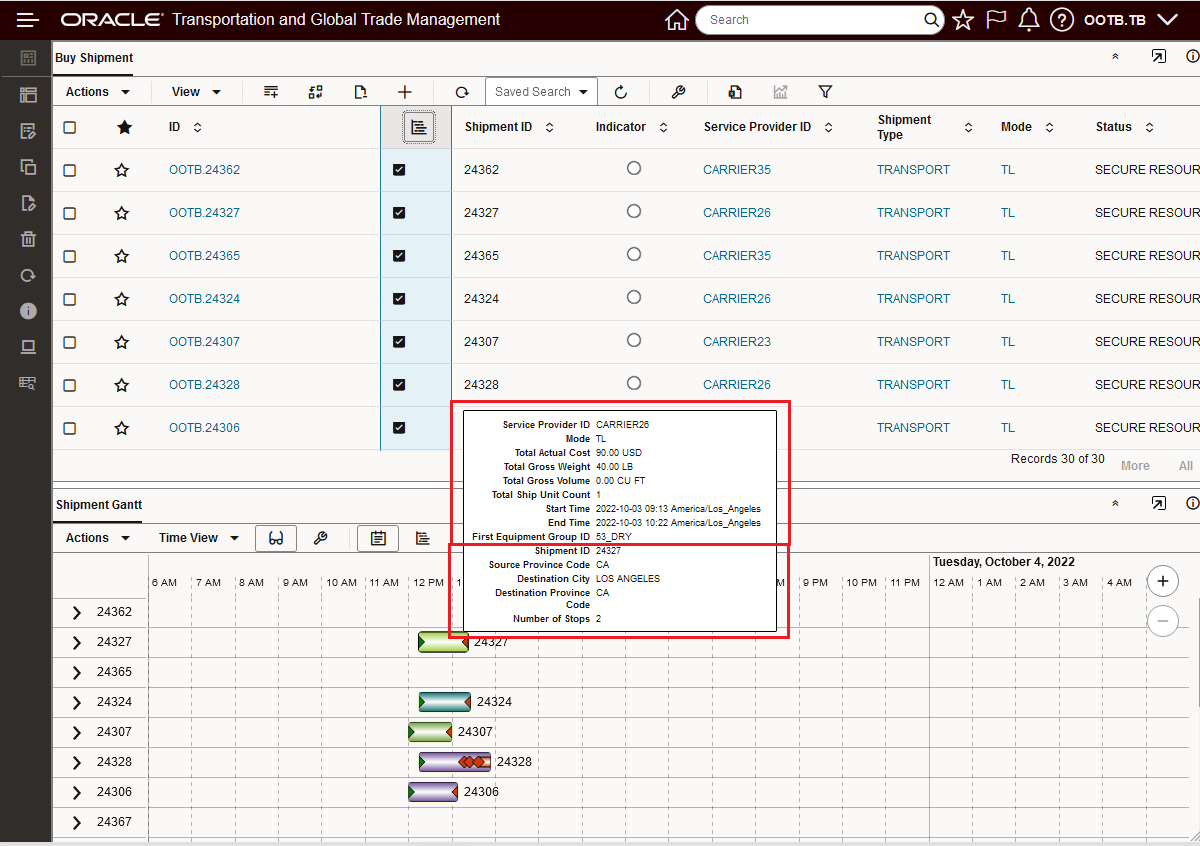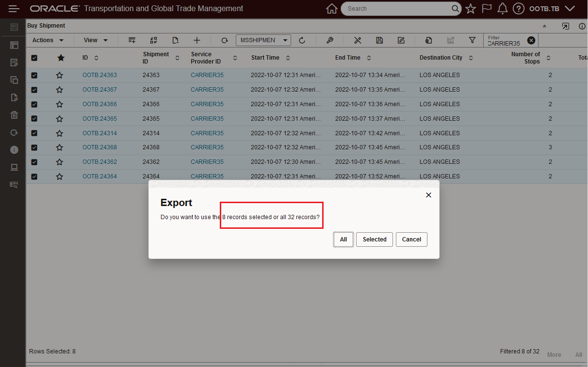 In the example below, the total shipments returned by the saved query (MSSHIPMENT) is 32, when the table is filtered to the text string CARRIER35 there are only 8 rows that meet that filtered criteria. When you now Select All in the filtered view - only the 8 filtered records are selected and will be acted on. To demonstrate the change, the Export action is used in the example below.