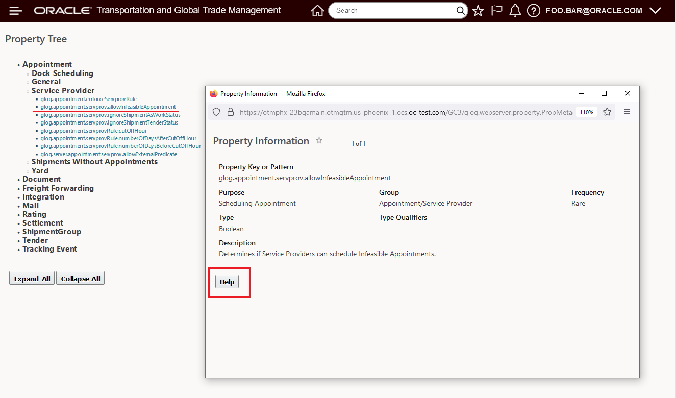 The example below highlights the Tooltips (hover over the property link) that are available in the Property Tree, for many properties the Tooltip alone can provide you with enough information to understand the options and usage for the highlighted property. In this case, the highlighted property will allow the Service provider to schedule infeasible appointments.