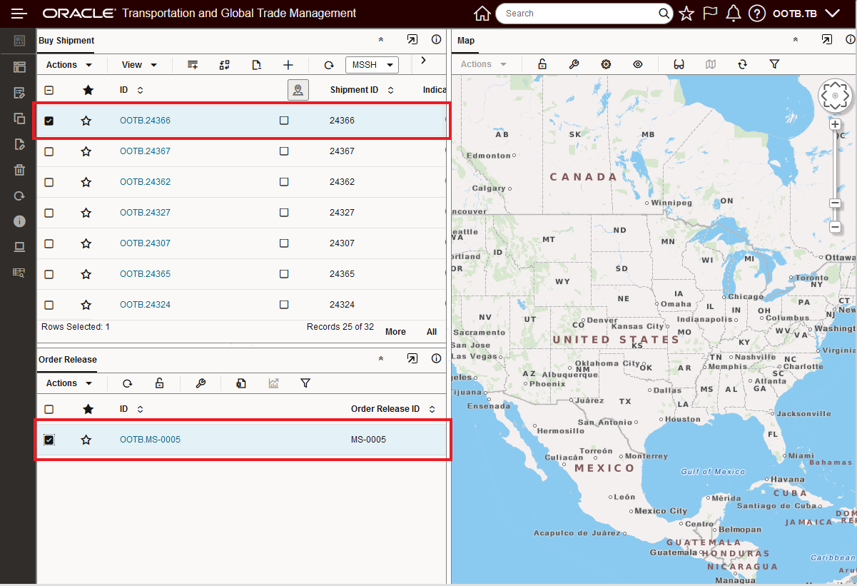 When the Enhanced Workbench with the Table Details configured above is opened, note that the first record in the Parent Table is not selected. Also note that since the first record is not selected no records are displayed in the related Order Release child table.