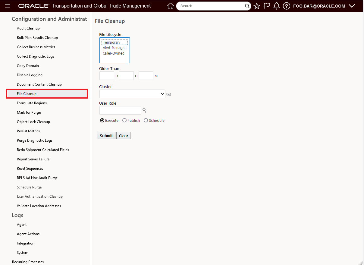 File Cleanup is accessed via Configuration and Administration > Process Management > Configuration and Administration > File Cleanup.