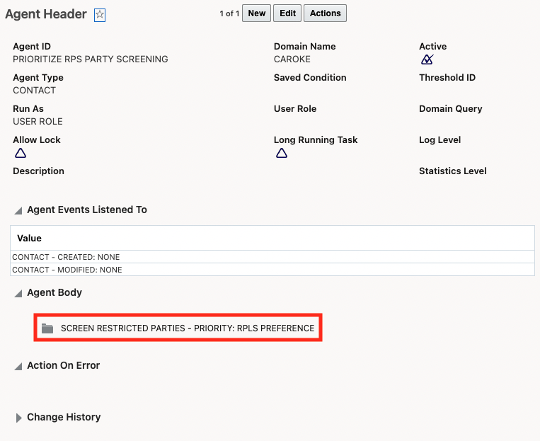 For the Agent Type = CONTACT, a new Agent Action called 'SCREEN RESTRICTED PARTIES - PRIORITY' has been added. When you create an automation agent using this agent action, the restricted party screening will use the new Event Queue = agentGtmRPLSPriority. This ensures that a party being created or modified will use a different event queue and threads from other types of restricted party screening such as screening the party master via process manager.