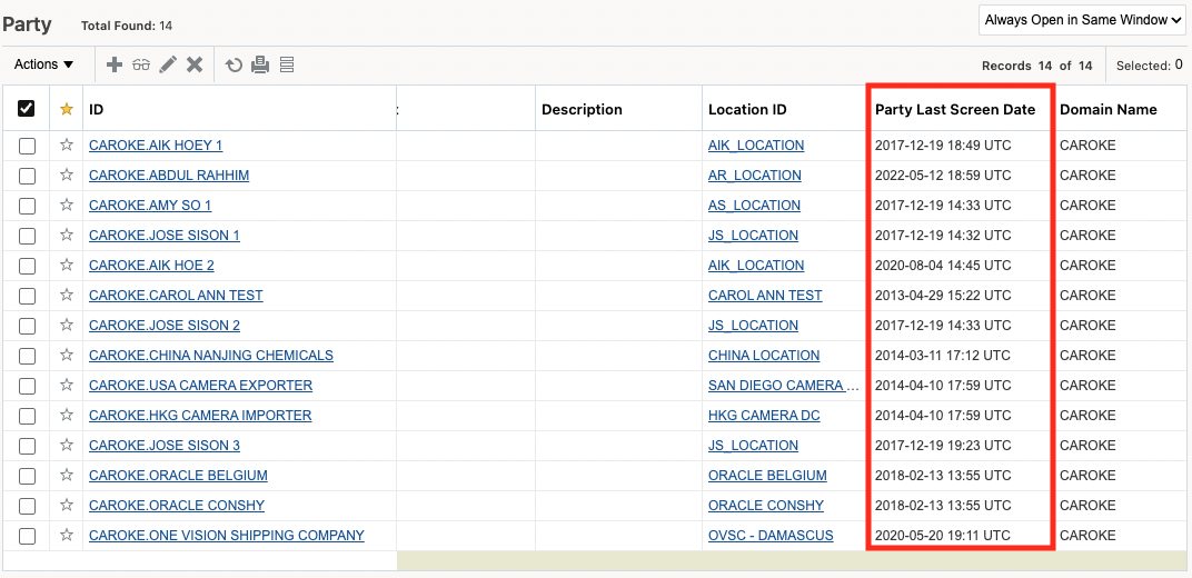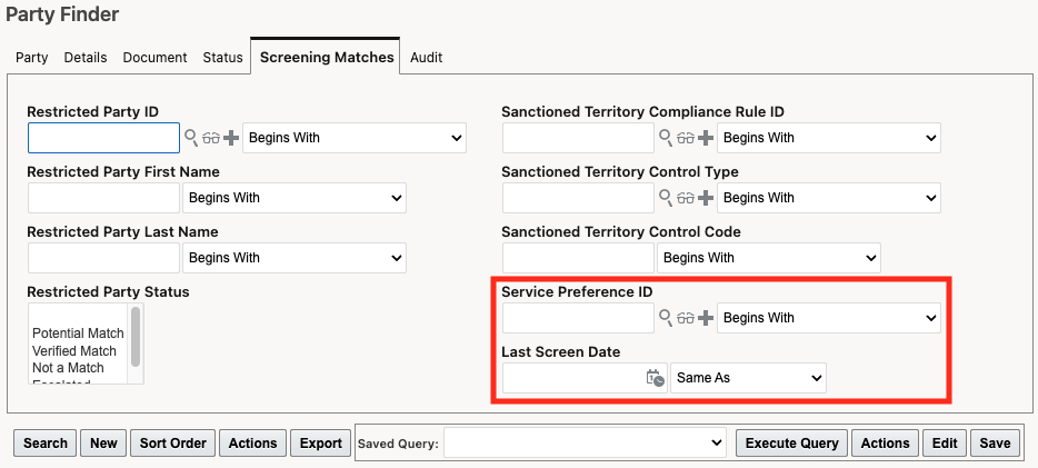 This feature enables you to search on and view the date of the most recent restricted party screening for a party. This will help you to understand if a party has been screened against the most recent denied party list.