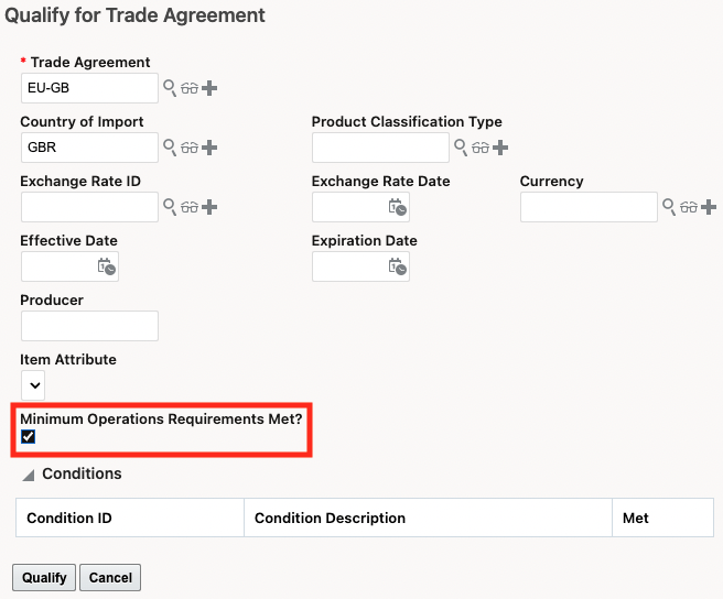 For example, the EU-GB trade agreement has a Rules of Origin Rule Type of MINOPS. When you trigger the Qualify for Trade Agreement action and select this trade agreement, GTM displays the 'Minimum Operations Requirements Met' checkbox.