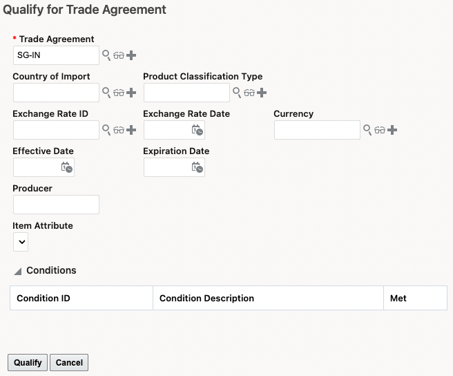 The SG-IN trade agreement does not have a Rules of Origin Rule Type of MINOPS. In this instance, when you trigger the Qualify for Trade Agreement action and select the trade agreement, the 'Minimum Operations Requirements Met' checkbox is not displayed.