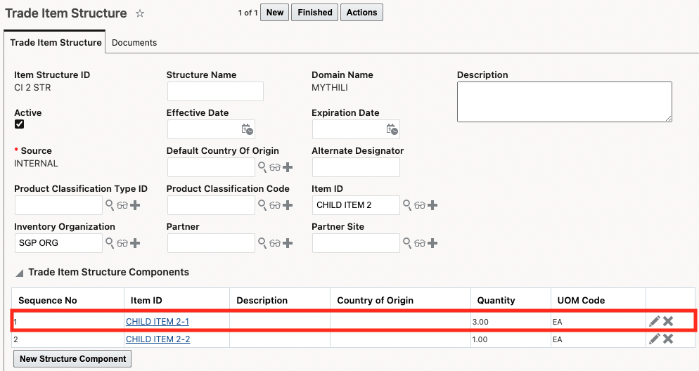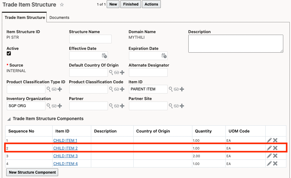 The intermediate BOM called CI 2 STR discussed above is then modeled as a Trade Item Structure Component within the finished good BOM called PI STR (Item ID = PARENT ITEM).