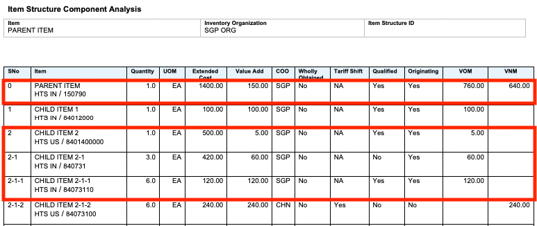 These calculations are reflected on the Qualification Report after you trigger the Qualify for Trade Agreement action. Note the highlighted areas in Qualification Report. You can see the total quantity of 6 EA for CHILD ITEM 2-1-1. However, CHILD ITEM 2-1-1 continues to have a quantity of 2 EA on the trade item structure component. Since this is contained in CHILD ITEM 2-1 which has a quantity of 3 EA, there are a total of 6 EA of CHILD ITEM 2-1-1 within CHILD ITEM 2.