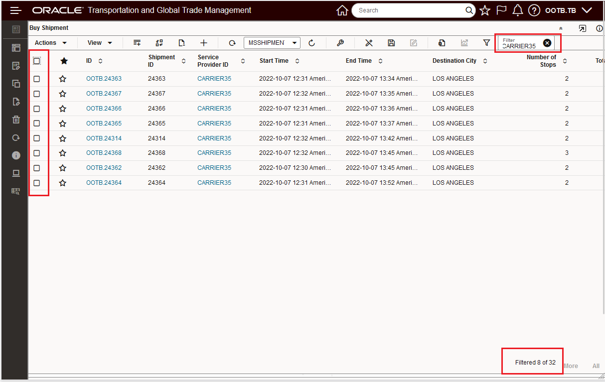 In the example above, all 32 records are selected, when you filter for CARRIER35 - the filtered view of 8 records is shown.