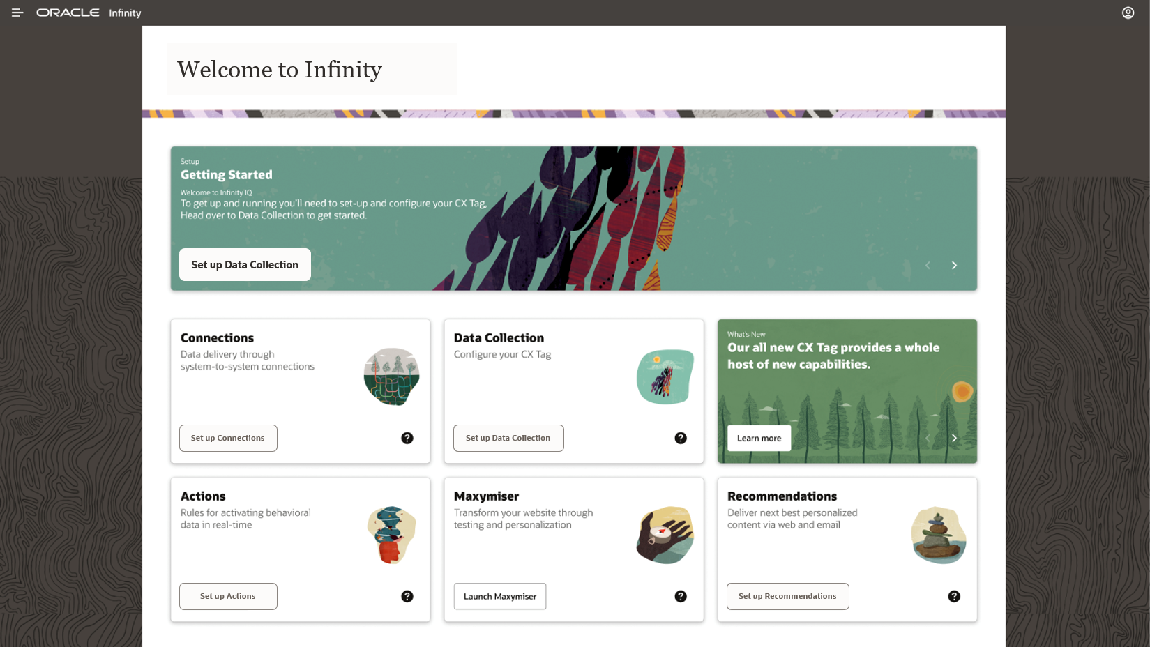 This dashboard will help you through the initial Infinity setup and administration. It will also help you navigate to the features that you have access rights to.