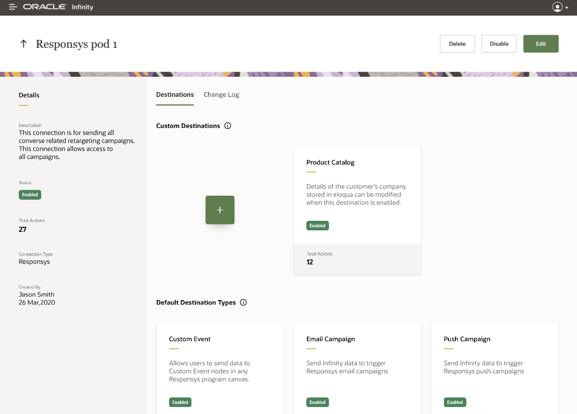 The new Connections feature introduces a simplified workflow to help you configure connections between Infinity and other Oracle solutions. These connections enable the delivery of data from Infinity to the connected solution. In this release, you will be able to configure a connection between Infinity and Responsys.