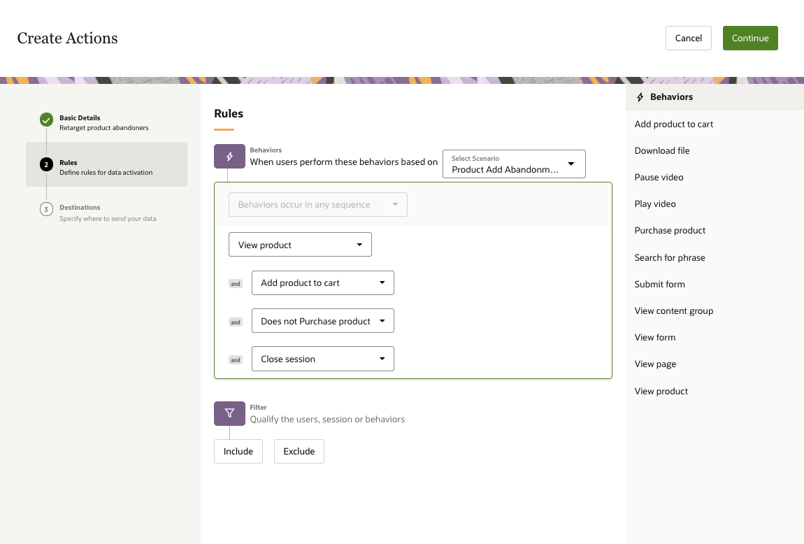 The new Actions feature provides an intuitive interface for configuring a set of rules using behaviors and filters. The Infinity platform then listens for these rules in real time. Once these rules are detected, the Infinity platform delivers relevant, contextualized data to your selected action system, such as Responsys. This way, you can optimize your customer's digital experience through better recommendations and personalization while your customer is still engaged. The result is increased online conversion rates, enhanced digital experiences, and improved business outcomes.