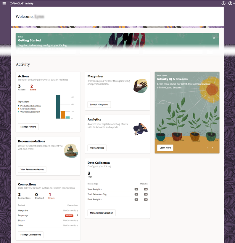 The Connections, Data Collections, and Actions cards on the Infinity Home dashboard are updated to show you more information. After you have set up Connections, Data Collections, and Actions, you will see at a glance what you have configured. The cards will also show you any errors that need your attention.