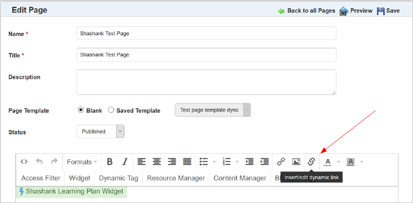 There is a new Insert/edit Dynamic Link button on the LearnCenter Designer WYSIWYG Editor bar, available for use with both Designer Pages and Templates. Use this button to create links to pages in sub LearnCenters.