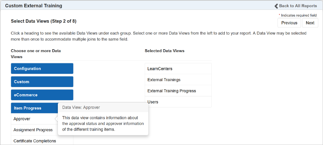 Refer to the online help topic called “Creating Custom Reports" (TOC > Reports > BI Reporting > Creating Custom Reports) for instructions on using data views with BI Reporting.