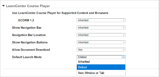You can now set the default launch mode for LearnCenter Courses, Document Courses, and SCORM 1.2 Courses played on the LearnCenter Course Player. You can do this at both the course and LearnCenter level.