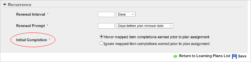 The Previous Completions field in the Recurrence section on the Options tab of the Edit Learning Plan window has been renamed to Initial Completions. This was done to clarify what the two accompanying option buttons are used for.