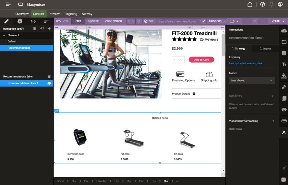 You can now add a Recommendations widget to your campaign and visually configure the strategy and layout. Recommendations can be shown to visitors who visit the page that matches either a HTML selector or a URL.