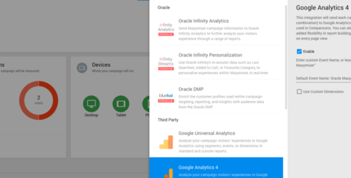 Google enables customers to dual run with Google Universal Analytics and Google Analytics 4 - so now you can add both Google Analytics integrations in Maxymiser.