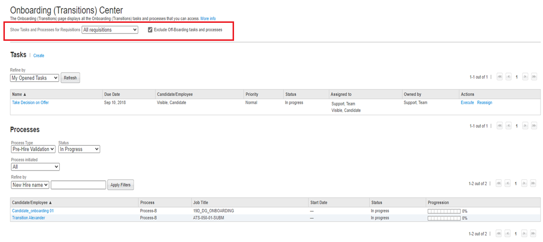 Two new filters are available in the Onboarding Center. The first, Show Tasks and Processes for Requisitions gives you the ability to filter your task and process lists by requisition owner and the second, Exclude Off-Boarding tasks and processes, does exactly that; it lets you exclude offboarding tasks and processes from your filter results. Let’s take a look.