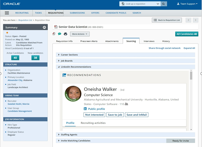 This feature streamlines the sourcing process by allowing you to directly source candidates recommended by LinkedIn from within Recruiting.