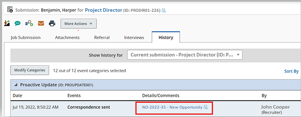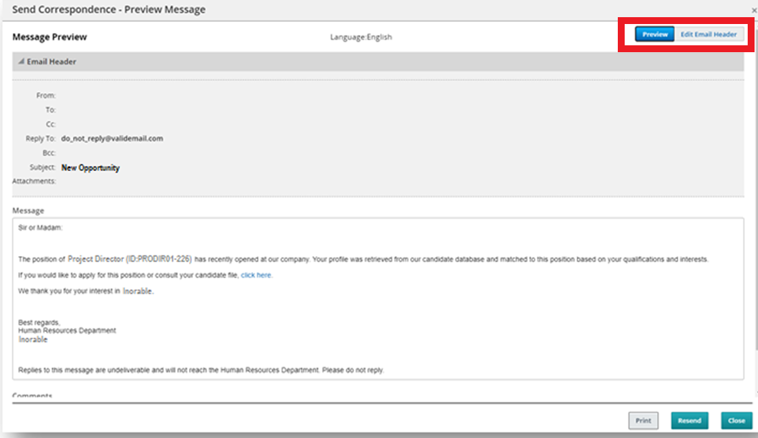 You can resend a previously manually sent email to candidates. You access this ability in the History tab of a submission. You're given the opportunity to edit the email header prior to resending.