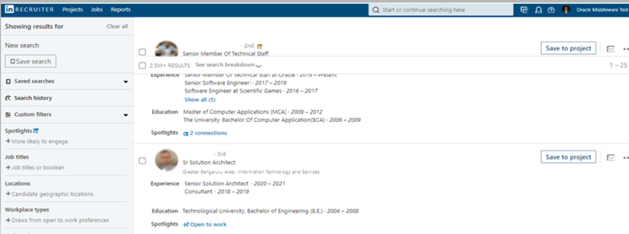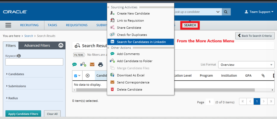 Search for Candidates in LinkedIn from More Actions Menu in Search