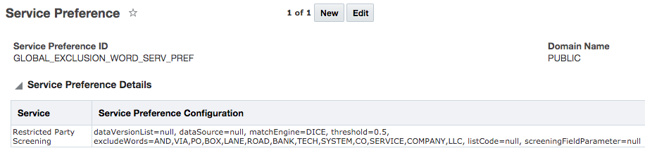 - Navigate to Master Data > Power Data > Configurations > Service Preference and edit the existing 'GLOBAL_EXCLUSION_WORD_SERV_PREF' service preference. Within the service preference, click the pencil to edit the existing 'Service = Restricted Party Screening' and click 'i' next to Service Preference Configuration. Add your list to the Exclude Words text field. (This service preference can only be edited as DBA.)