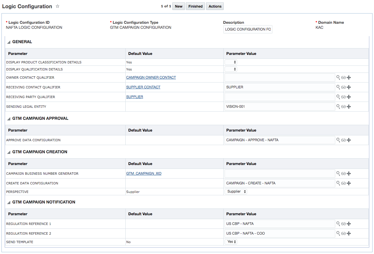 - In the Logic Configuration with a type = GTM CAMPAIGN CONFIGURATION, the new parameter is called 'DISPLAY PRODUCT CLASSIFICATION DETAILS'. The default value is Yes meaning the product classification data will be displayed on the campaign and campaign line.