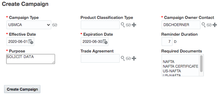You no longer need to enter a product classification type when creating a campaign. This enables you to create a campaign to solicit documents and data that are not related to a particular product classification code.
