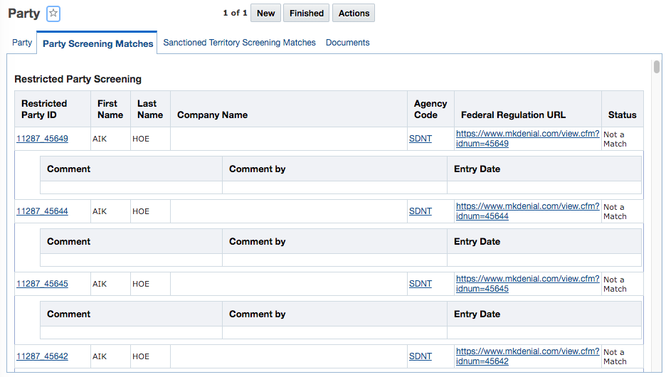 This property applies to all restricted party screening actions across GTM including actions on Parties, Trade Transactions, Trade Transaction Lines, Declarations, and Declaration Lines. The property also applies to the ad hoc Restricted Party Screening page.