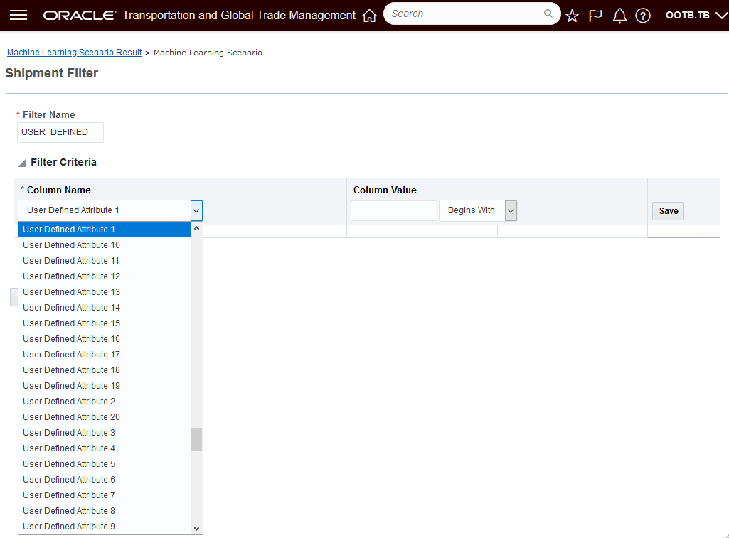 Machine Learning Scenario Shipment Filters - User Defined Attributes added as Shipment Filter Criteria. You can use your Shipment User Defined Attributes to narrow down the list of shipments based on the selected User Defined Attribute.