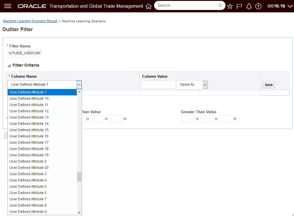 Machine Learning Scenario Outlier Filters - User Defined Attributes added as Outlier Filter Criteria you can enter the desired User Defined Attribute and value and Actual Transit Time value (less than/greater than) to filter.