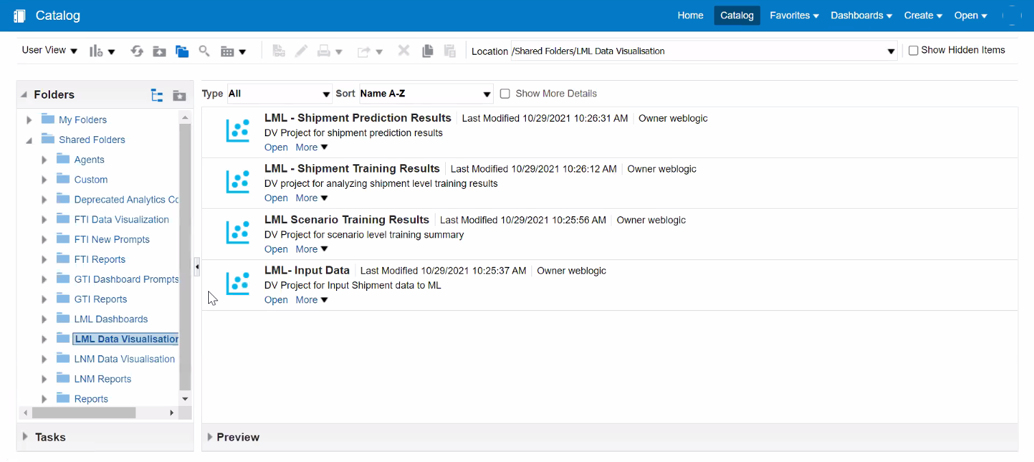 Other pre-defined projects provided for Machine Learning include LML - Shipment Prediction Results and LML - Shipment Training Results shown below.