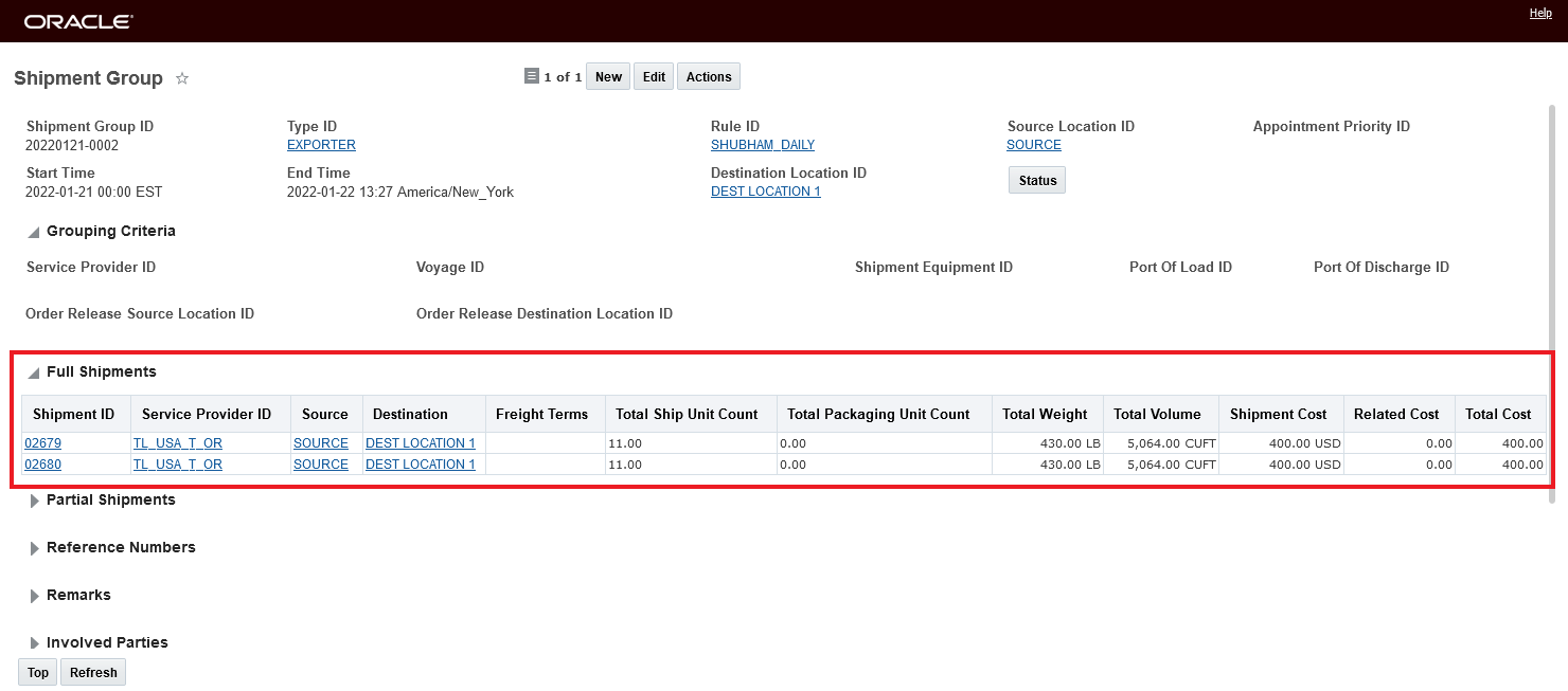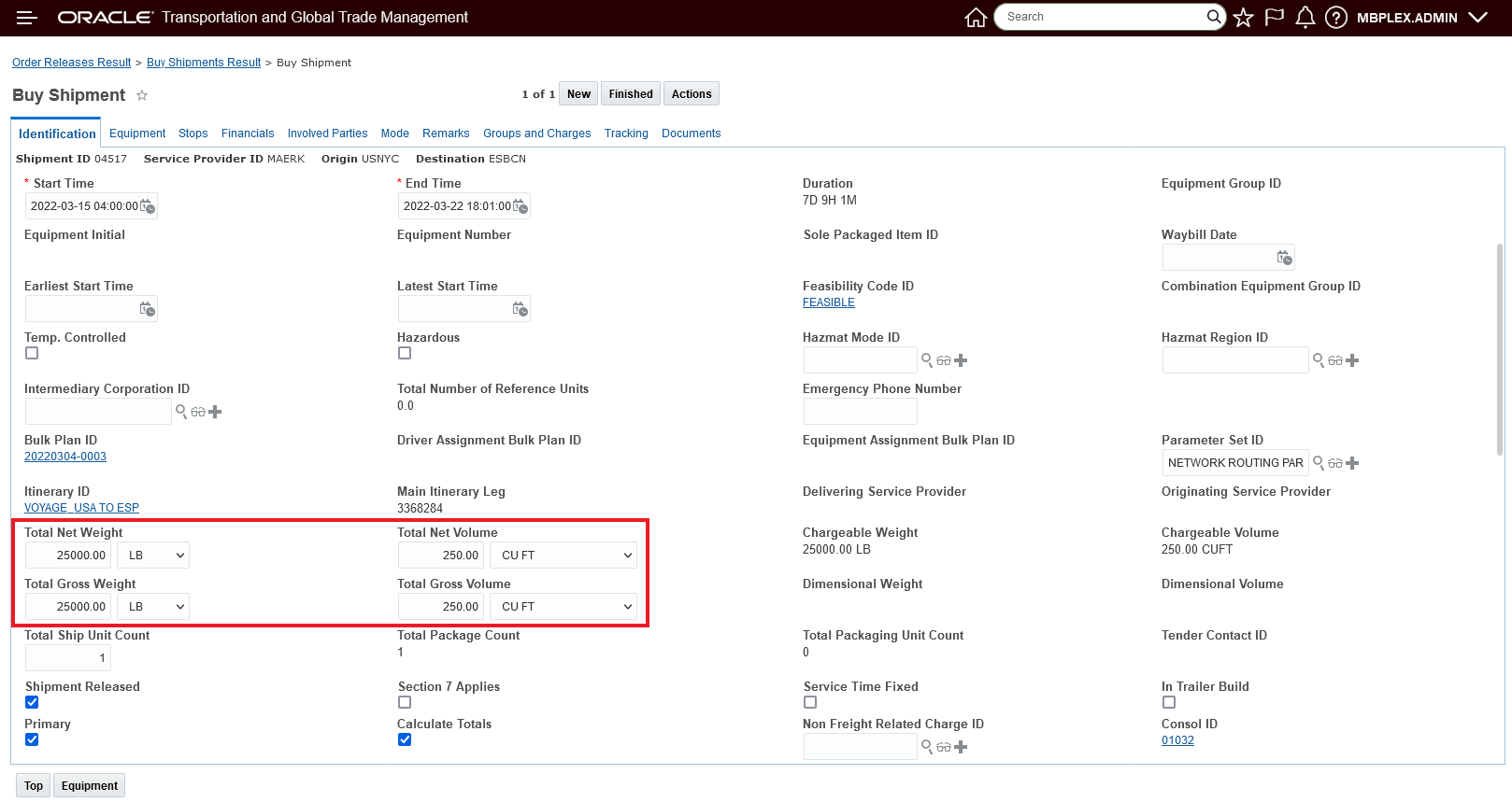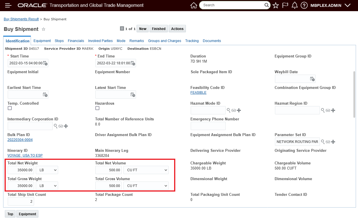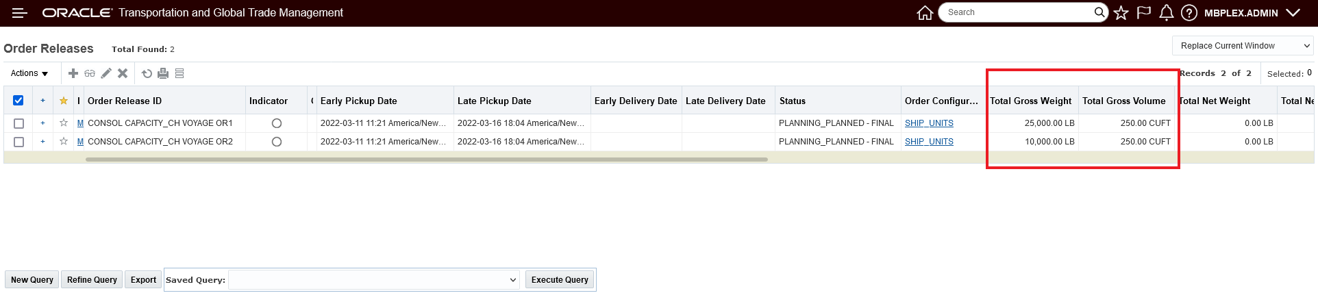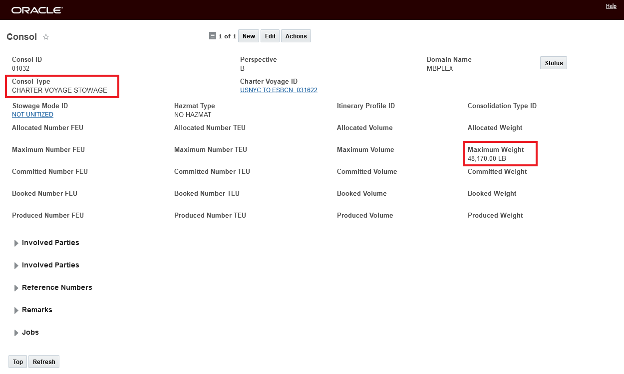 The details of the Consol Shipment 04517 after both orders have been planned is below. In this case, 35,000 LB and 500 CU FT of available capacity have been consumed by the two order releases planned.