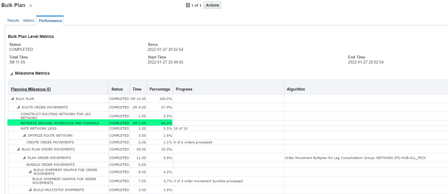 This feature adds two bulk plan milestones to the Bulk Plan Results – Performance tab to provide you with additional insight into the planning milestones related to the Network Routing planning option. The added milestones are Retrieve Ground Schedules and Consols and Perform Dynamic Clustering. The additional milestones will provide additional insight into the planning steps performed and will be useful in diagnosing performance related planning issues.