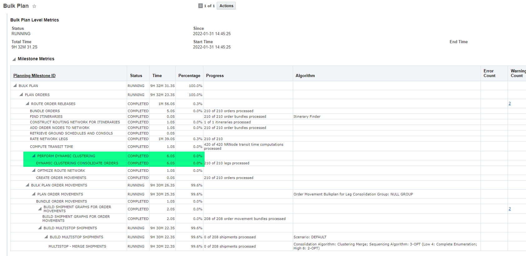 The Perform Dynamic Clustering milestone tracks the process performed at the beginning of route selection for the orders and consolidations done on network legs.