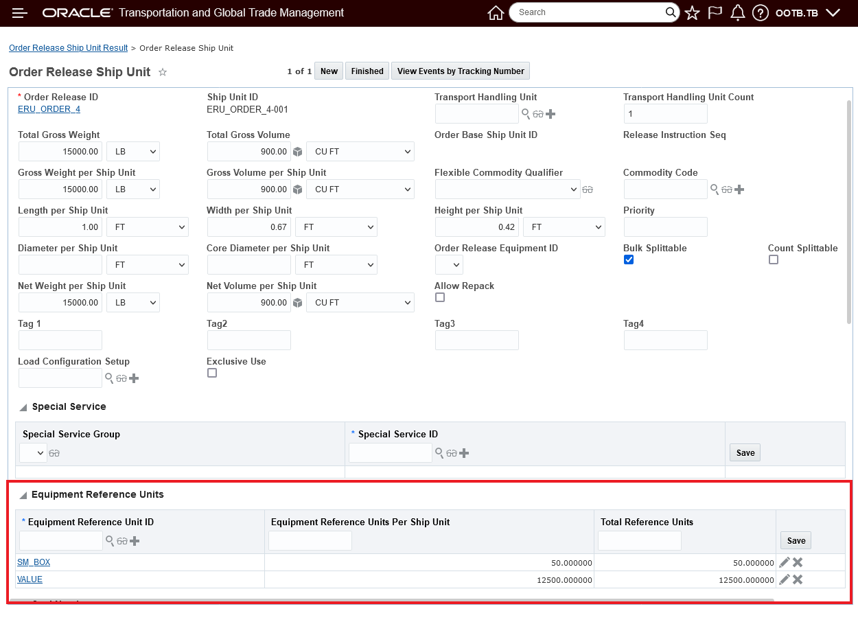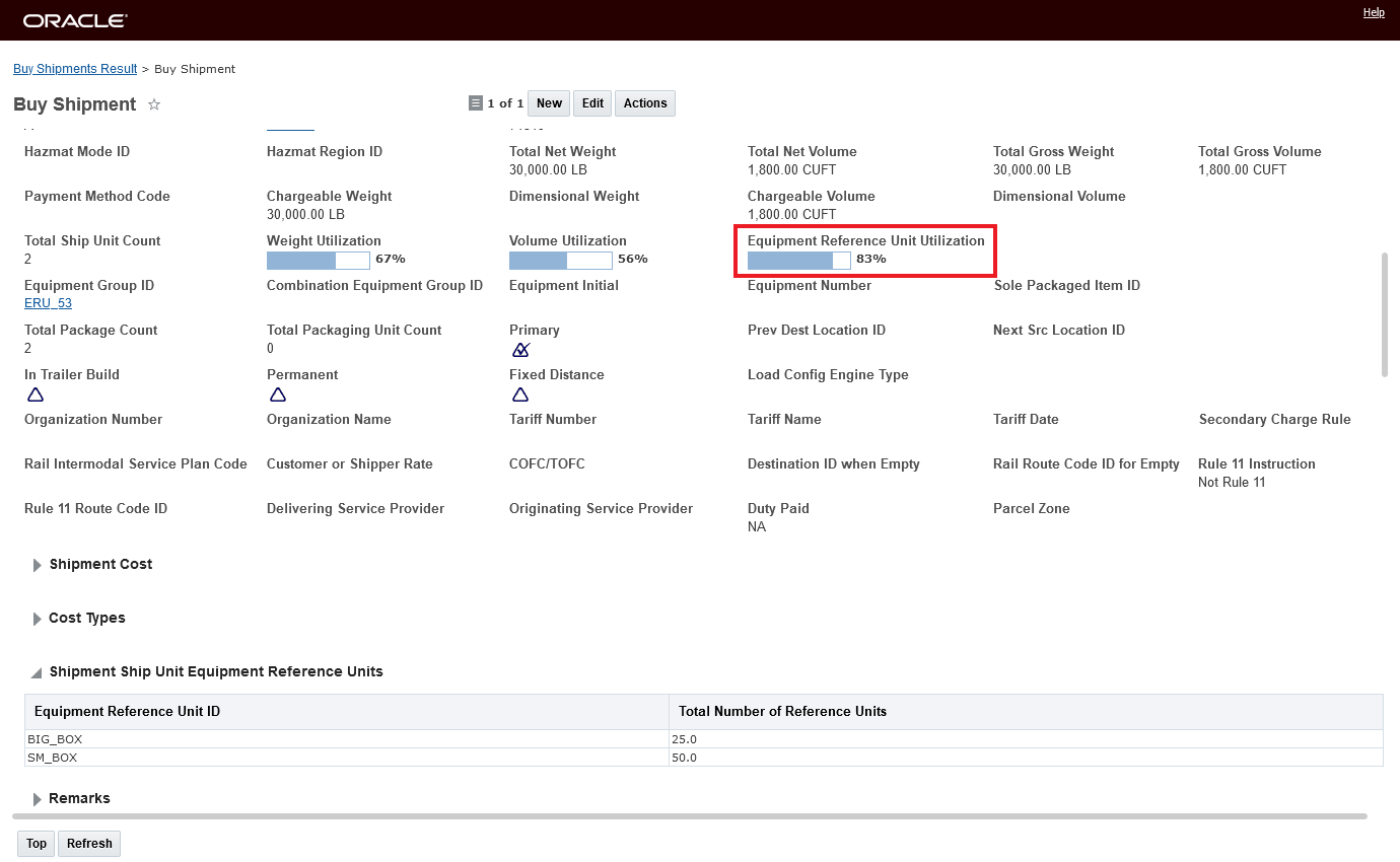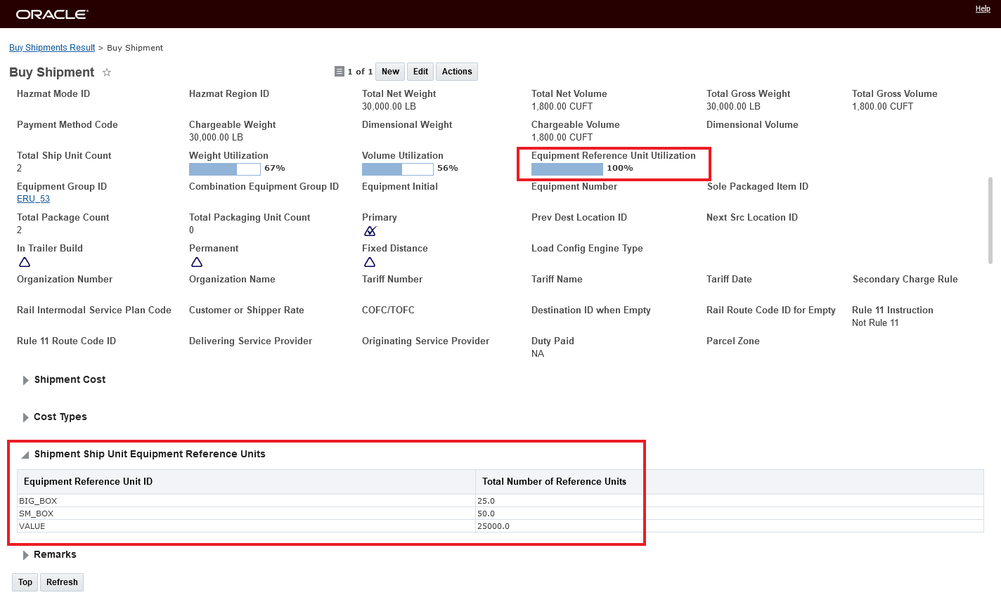 Using the same order as above - 50 Small Boxes, 25 Large Boxes and adding in a Value ERU amount of 12,500 units for each of the two Ship Units on the shipment - the shipment Equipment Utilization is now at 100%. The 100% utilization is based on the evaluation of the Independent Value Equipment Reference Unit – at 100% (25,000/25,000) and comparing that value to the total for all the non-Independent Equipment Reference Units of 83% and selecting the higher value of the two.