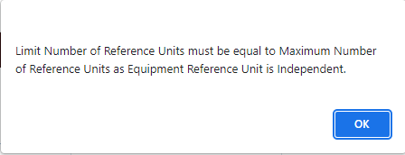 Note that when you define the Independent Equipment Reference Unit Capacity the Limit Number of Reference Units value and the Maximum Number of Reference Units value must be the same - this is required/by design since the Independent Equipment Reference are evaluated independently. If the Limit Number of References Units is not equal to the Maximum Number of Reference Units, you will receive the error below.