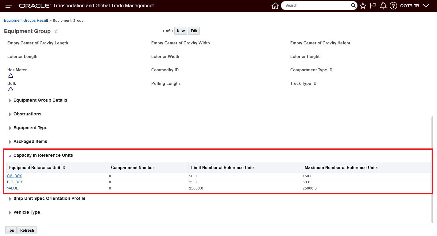 Continuing with this example, assume that there is a restriction to limit shipments to having only 25,000 units of value. The value limit is independent from the calculation of utilization associated with loading the Small and Big boxes. The Value Equipment Reference Unit below defines the desired value requirement using an Independent Equipment Reference Unit.