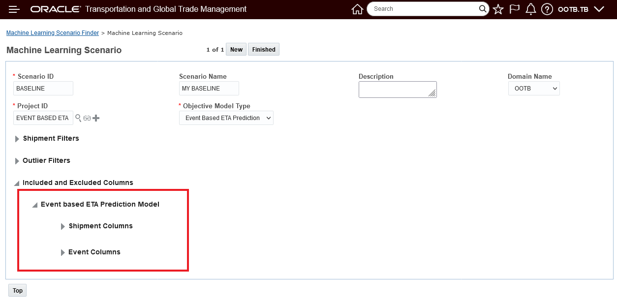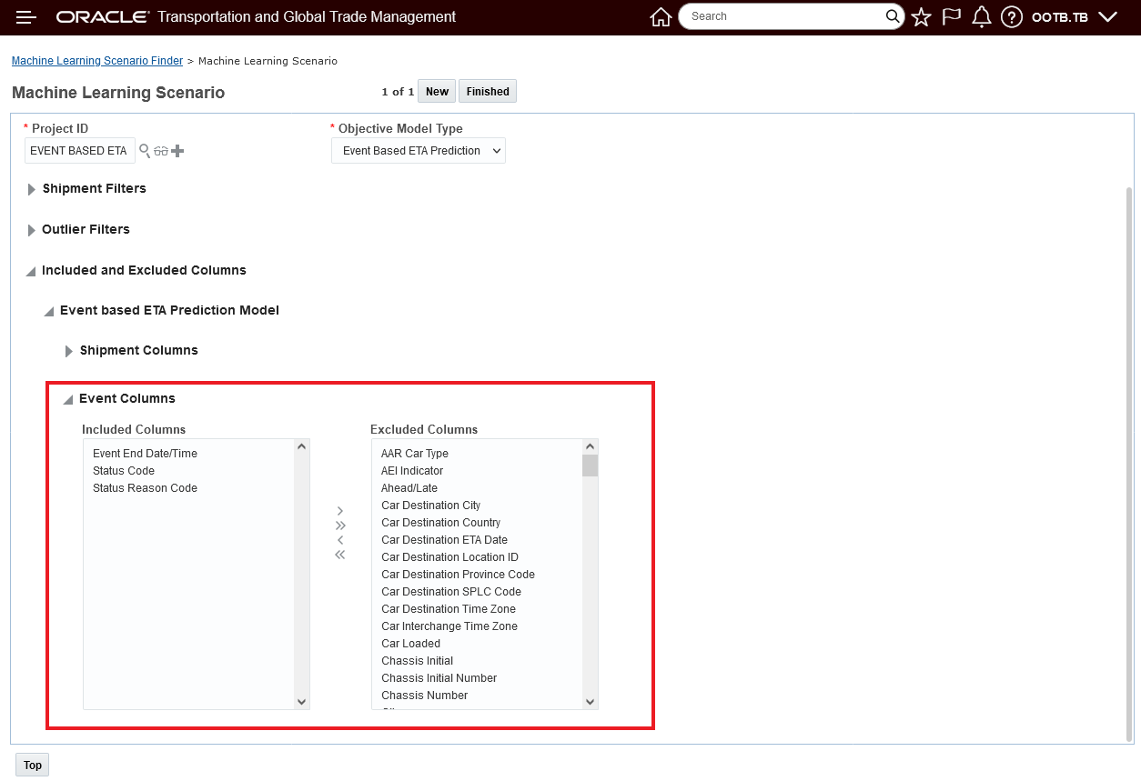 For Event Based ETA Prediction Machine Leaning Scenarios - you will see both a Planned ETA Prediction Model section and an Event based ETA Prediction Model section - Shipment Columns and Event Columns.