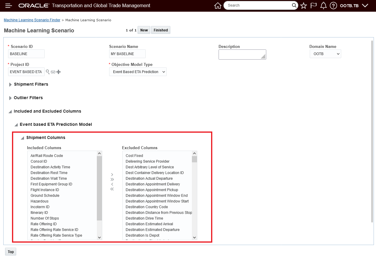 The ETA based Prediction Model provides many options for determining the Shipment Columns to include or exclude in your model development. By default (as shown below), there are a number of included and excluded columns.