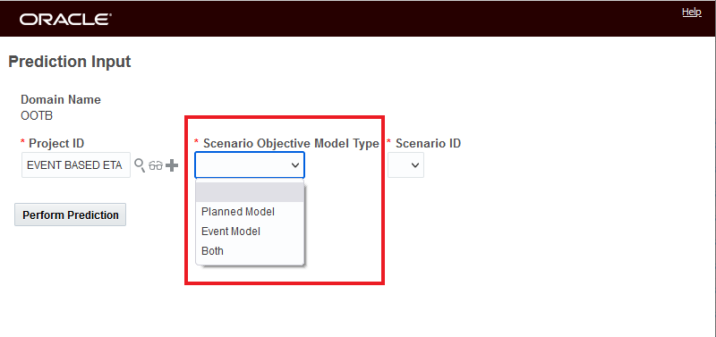Once the Planned and Event based ETA Prediction model is developed you have the option, when running Perform Prediction against your shipments, to select the Scenario Objective Model Type to use - either the Planned Model, the Event Model or Both.