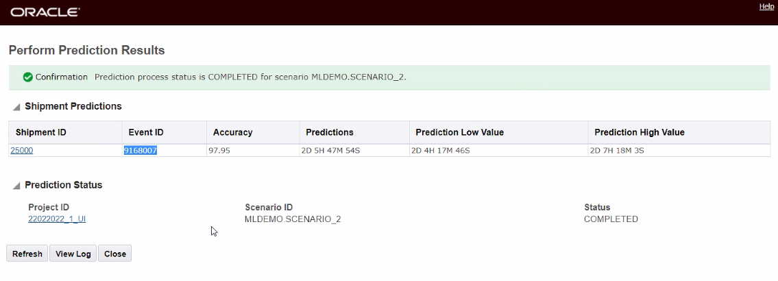 The process and results for the Perform Predication action are the same as the Planned ETA model type. The prediction results are provided once the prediction process is complete for the selected shipment or shipments.
