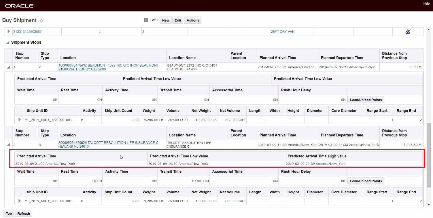For the shipments where the Perform Prediction action has run, the ETA predictions will be provided at the stop level as shown below.