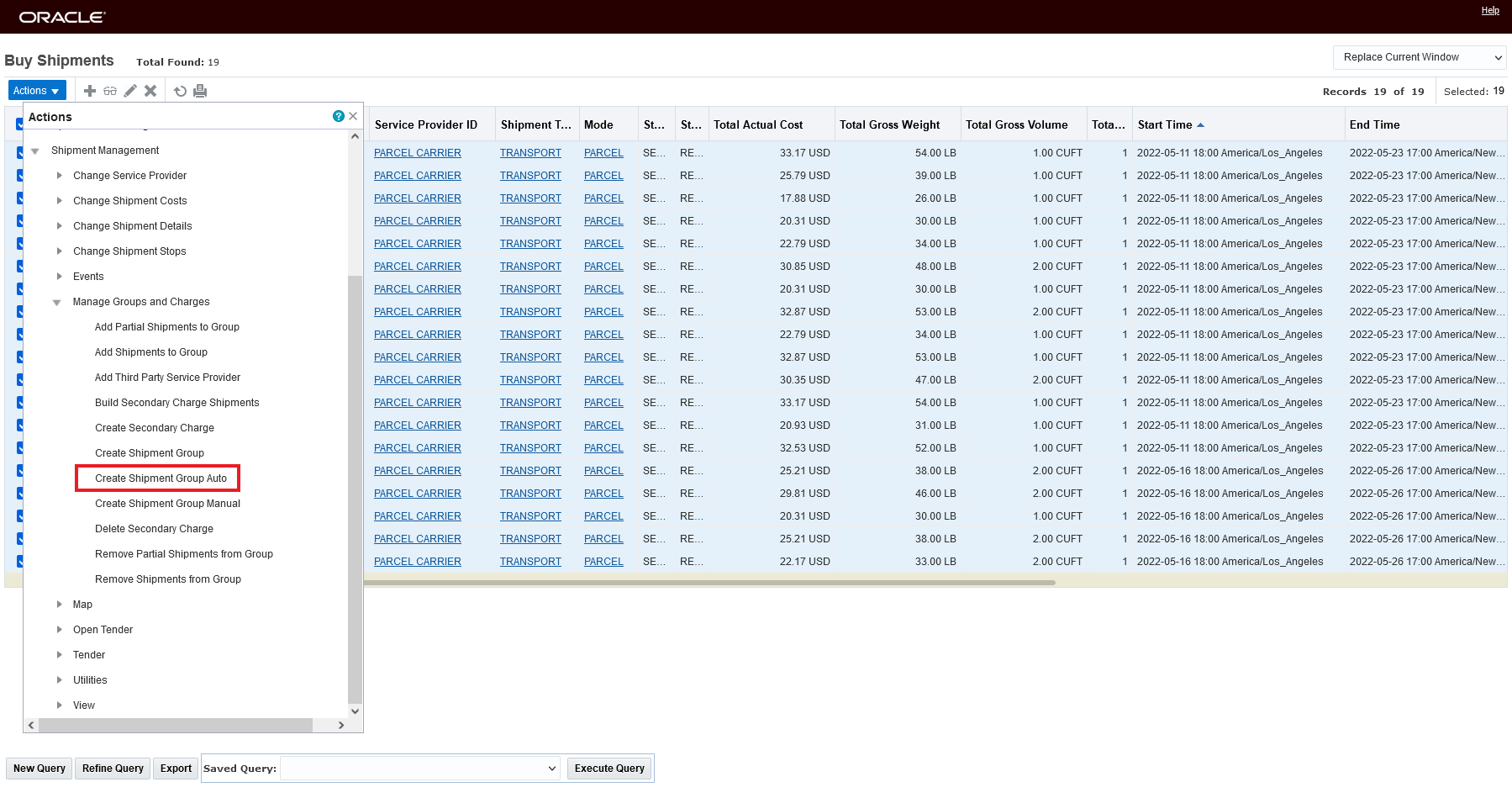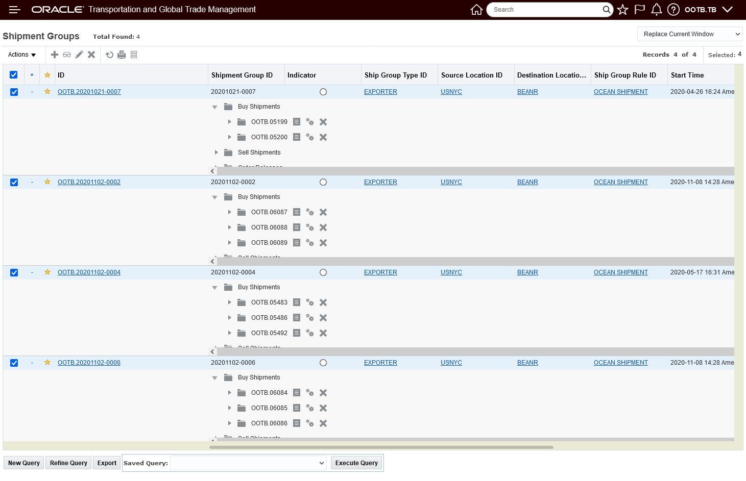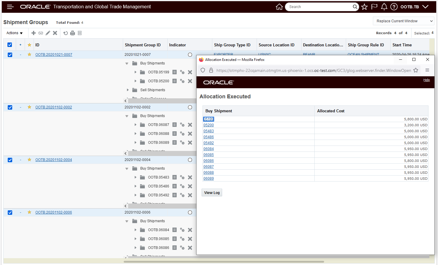 The Allocate Shipments of Shipment Group UI Action is a multi-select action. In the example below, four shipment groups containing eleven shipments are allocated in one run of the Allocate Shipments of Shipment Group UI action.