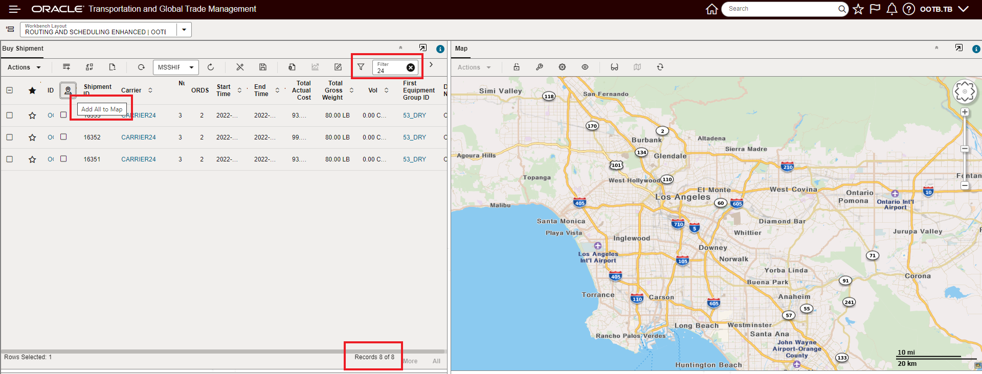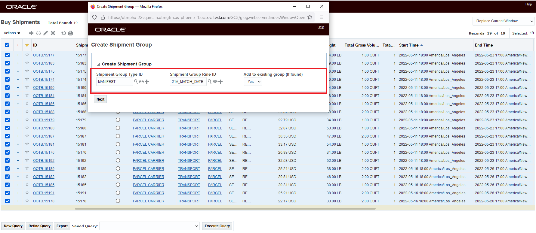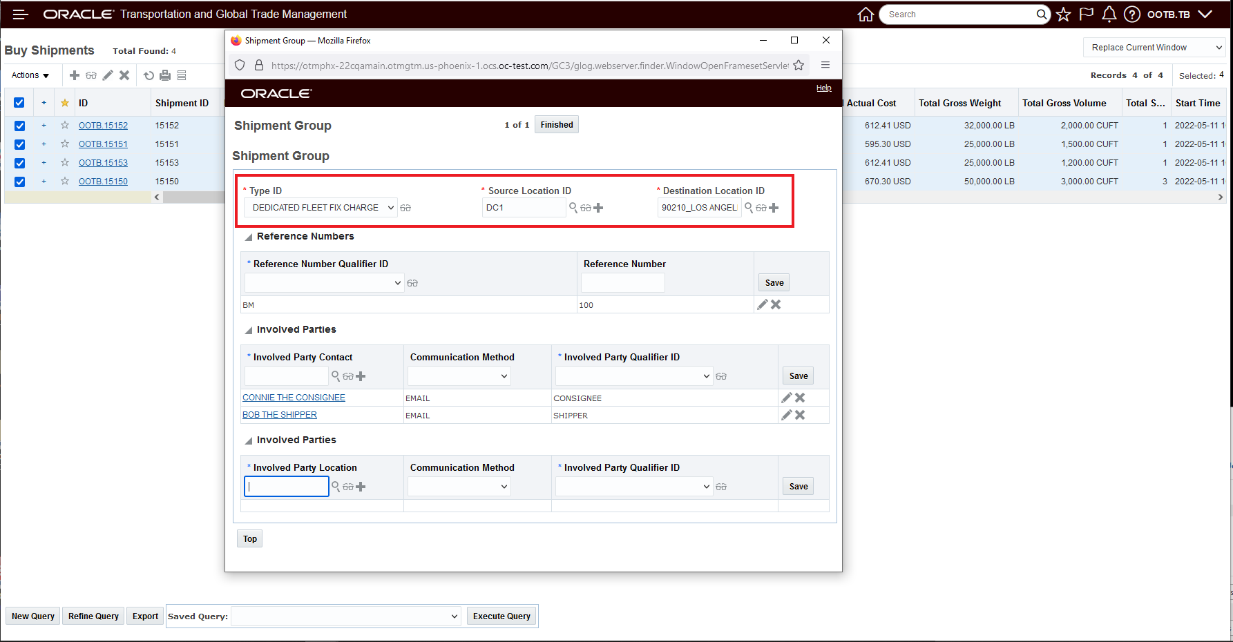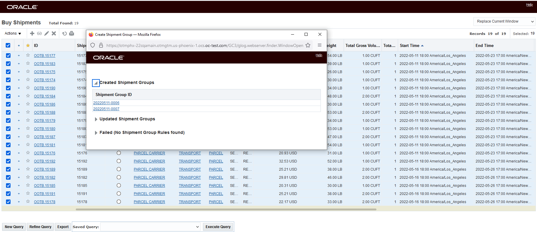 The Allocate Shipments of Shipment Group UI Action is a multi-select action. In the example below, four shipment groups containing eleven shipments are allocated in one run of the Allocate Shipments of Shipment Group UI action.