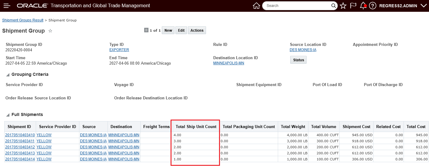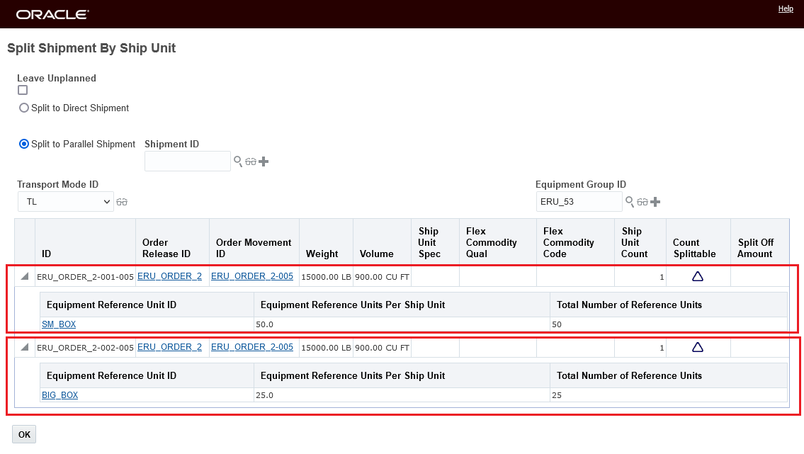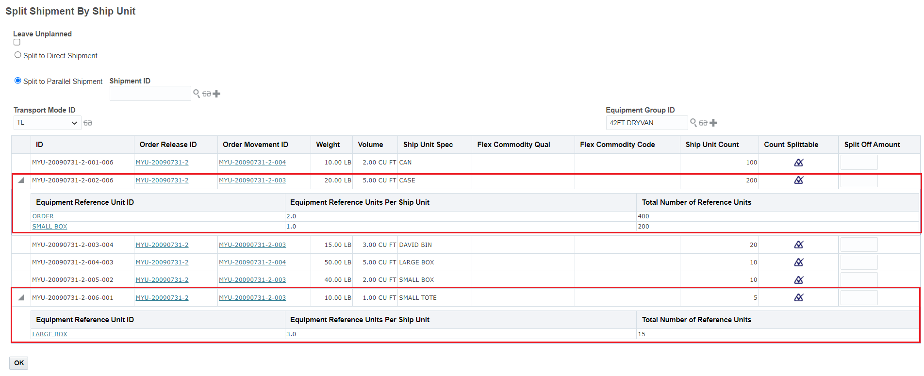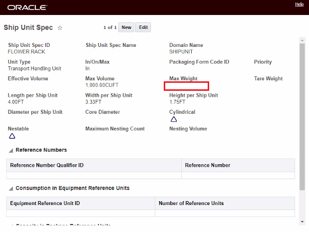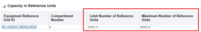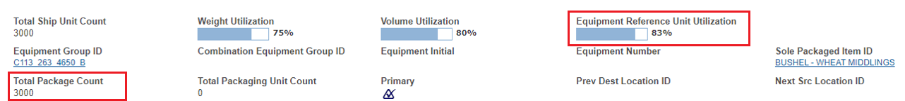 Based on the setup above and a one for one with packaged items - the shipment below honors the Limit Number of Reference Units - 3000.0 and the Equipment Reference Unit Utilization is 83% - 3000.0 (Limit)/3600.0 (Max)