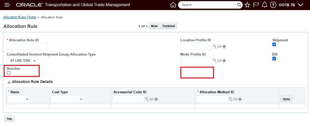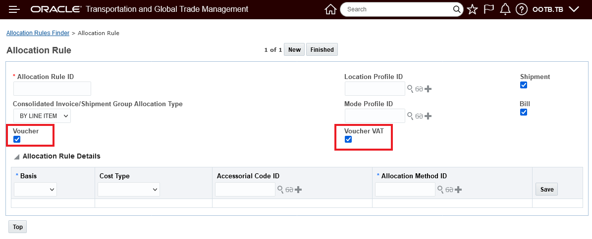 This feature enhances the Allocation Rule to provide you with the option of allocating the voucher VAT amount to the order release, order release line or order base line.
