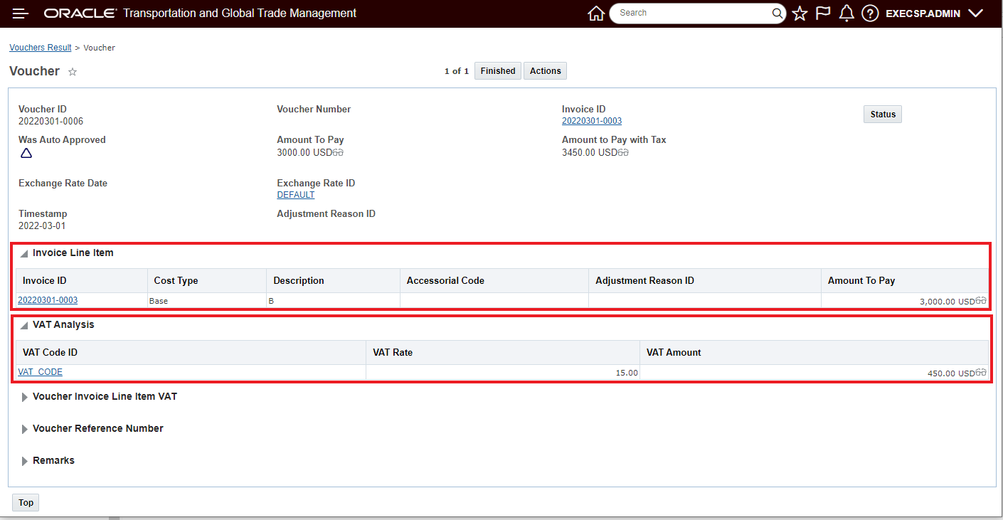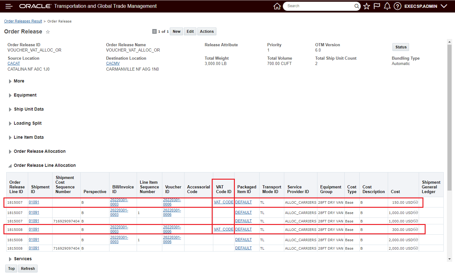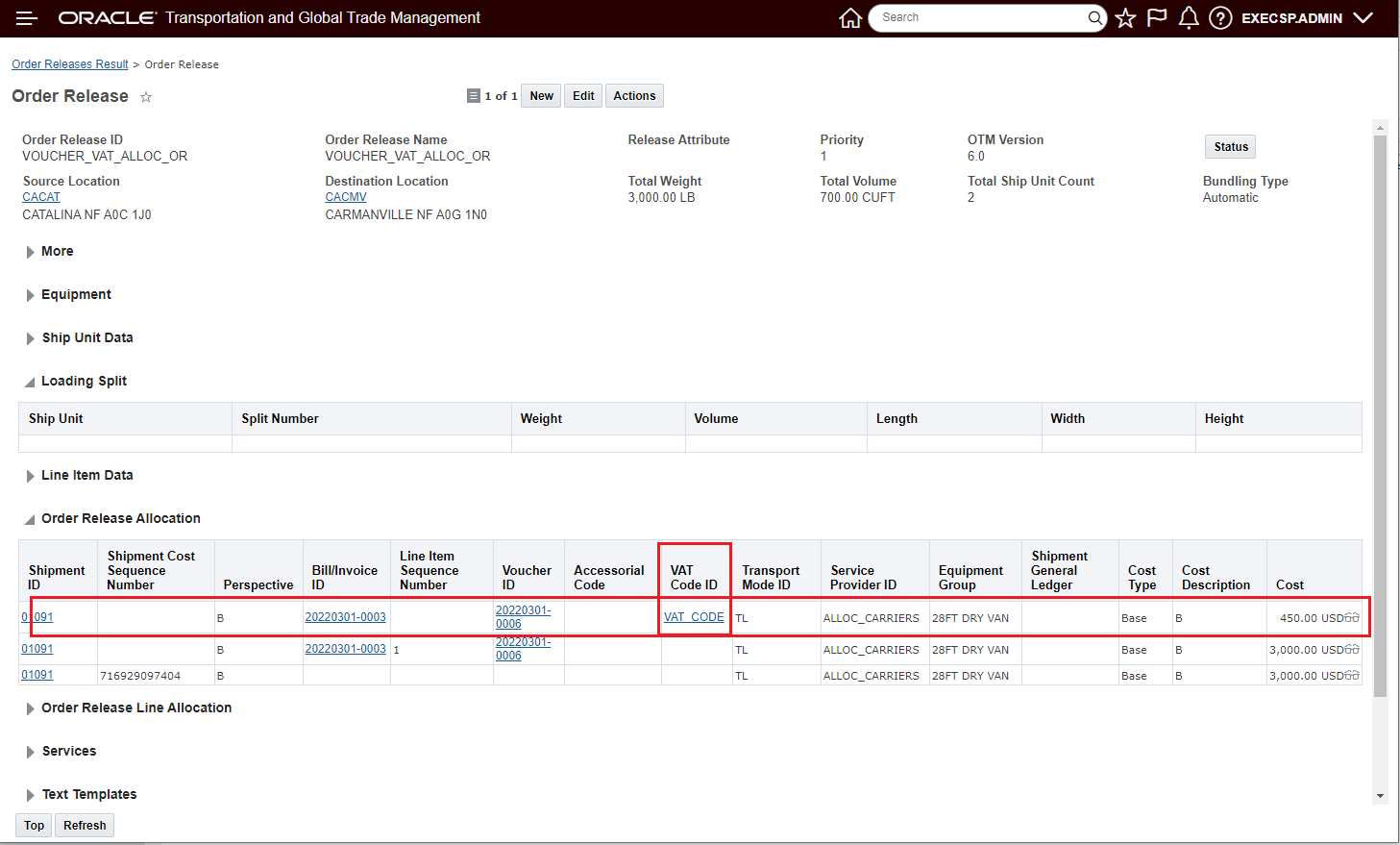 In the example below - the Voucher has a Base Cost of 3000 USD - the VAT is 15% or 450 USD. The VAT will be allocated to the Order Release by weight and then to the Order Release Line.