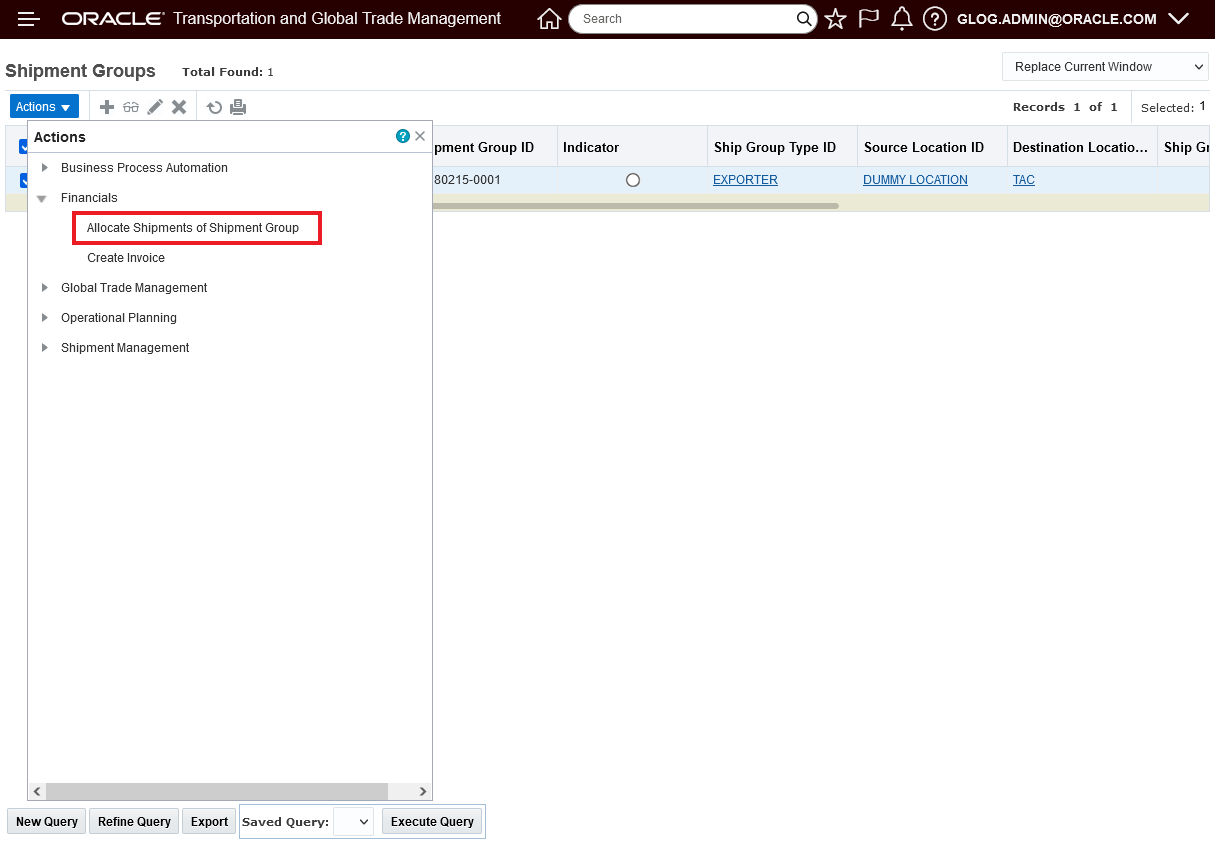 The new UI action is available under Shipment Management > Group Management > Shipment Group > Actions> Financials > Allocate Shipments of Shipment Group.
